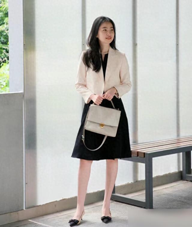 职场女性:用“柔 + 刚”中和严肃感。 裸粉色西装搭配亮彩花裙,西装的干练与裙子的柔美相互碰撞,既显专业又具亲和力;缎面半裙搭配短款针织衫,外搭黑色小香风外套,开会时是利落干练像“职场玫瑰”,下班约会秒变“温柔姐姐”。